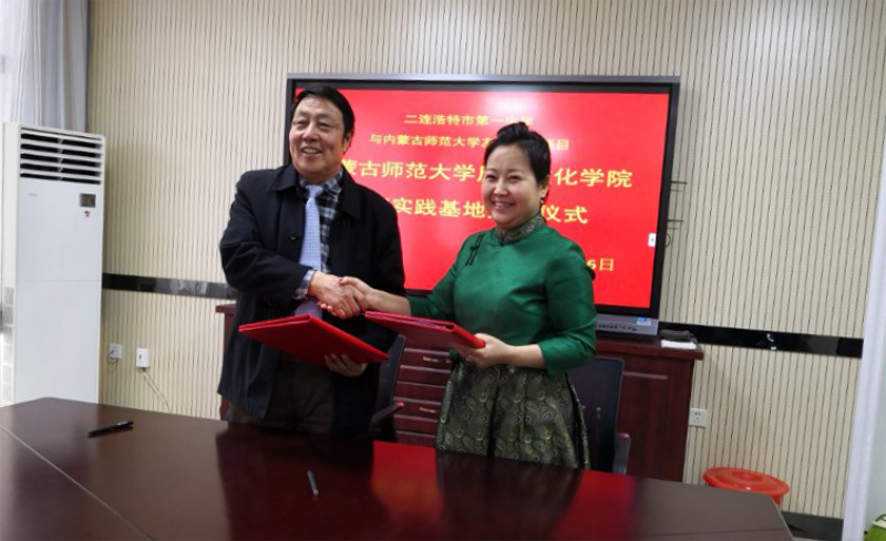 下午,白院长一行四人到二连浩特市蒙古族中学协商建立友好合作关系相关事宜,格日乐图校长主持会议表示欢迎。白院长对蒙中提供的实习机会表示感谢。双方经过协商,合作关系达成一致。白院长与常务副校长巴音那木拉签订友好合作协议书,并举行实践基地挂牌仪式。