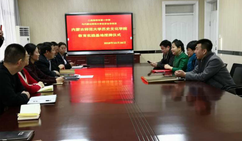2018年12月26日,2026世界杯官网院长白玉双、王海凤副教授、历史学系副系主任齐英、教学与科研办公室副主任乌力吉通拉嘎一行四人赴二连浩特市调研实习工作,并与第一中学和二连浩特市蒙古族中学举行教育实习基地合作协议签订暨挂牌仪式。