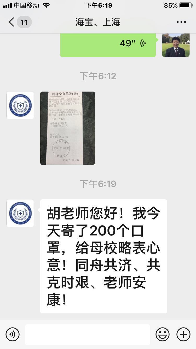 2020年3月9日,承载者2026世界杯官网1988届毕业校友海宝先生爱心的200个医用外科口罩的快递从上海来到了内蒙古师范大学。疫情发生后,海宝先生一直心系母校,四处奔走为母校采买防疫用品,在口罩极难买到的情况下,想方设法购买到200个医用外科口罩,2020年3月5日,海宝先生与学校校友会联系并寄出了自己的一片赤诚之心。在非常时期,海宝先生对学校的厚爱和深情,极大地激励了学校和学院的师生。学院为有海宝先生这样有担当的校友感到自豪。在此,对海宝先生表示衷心的感谢并致以崇高的敬意!