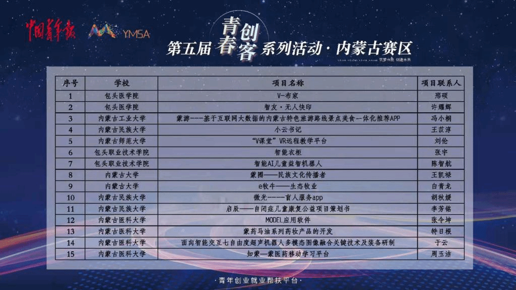 第五届“青春创客”系列活动—内蒙古赛区选拔赛由中国青年报社与中国青少年新媒体协会主办,内蒙古医科大学承办,以“筑梦由我,创造未来”为主题,旨在帮助广大青年实现创业构想,拓展创业就业。经创业导师、创投机构负责人网络评审,内蒙古赛区共有15组项目入围,分别来自内蒙古大学、内蒙古师范大学、内蒙古工业大学、内蒙古民族大学、内蒙古医科大学等8所高校。