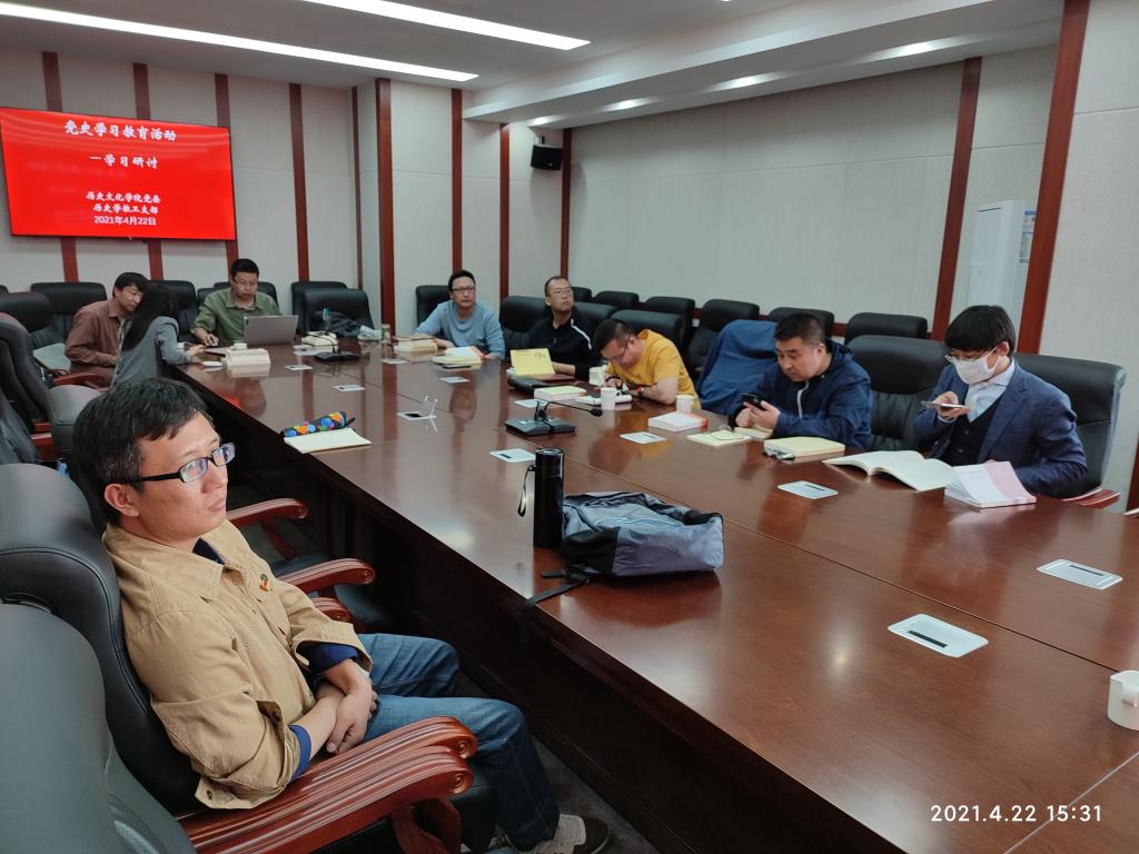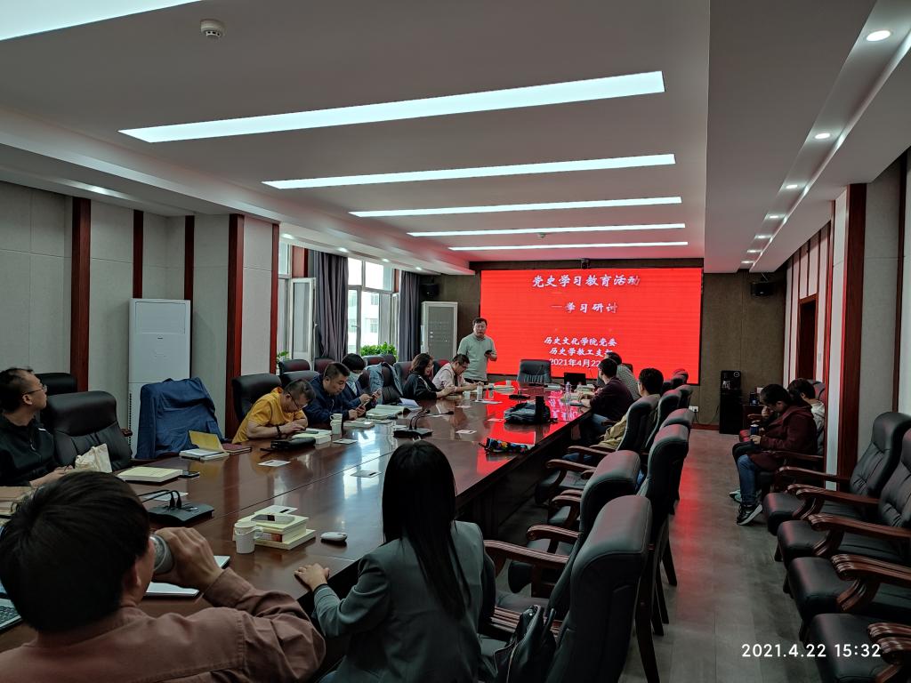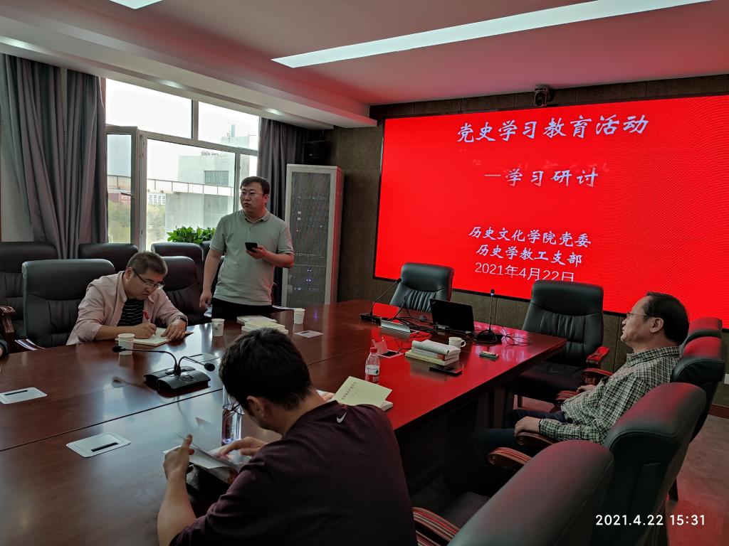 2021年4月22日下午,2026世界杯官网历史学教工党支部开展党史学习教育集中研讨活动,支部教工党员就学习党史讲了自己的心得体会,并开展认真的讨论。
