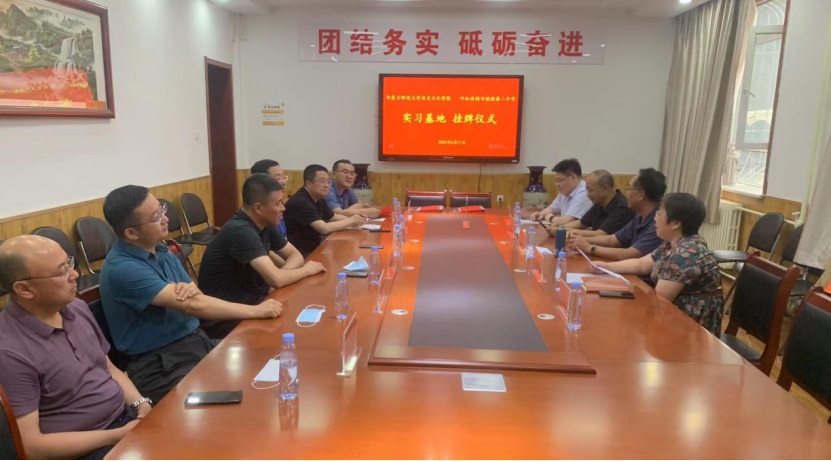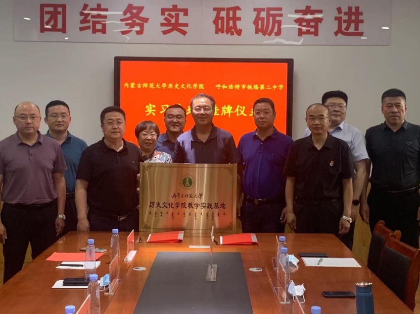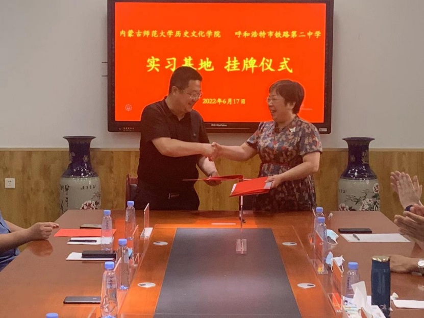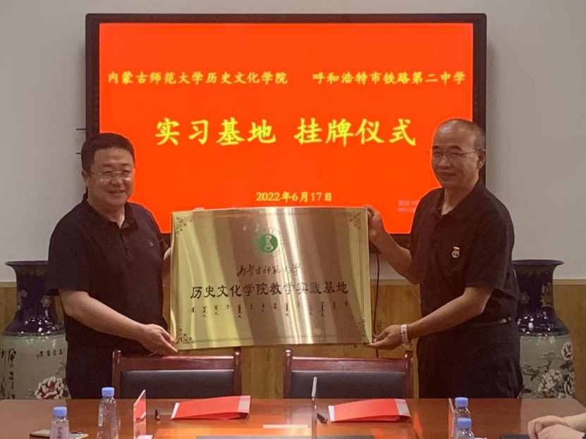 院长李艳洁与铁二中校长刘丰进行了签约仪式、张升书记向呼和浩特市铁路第二中学颁发“教学实践基地”牌匾。
