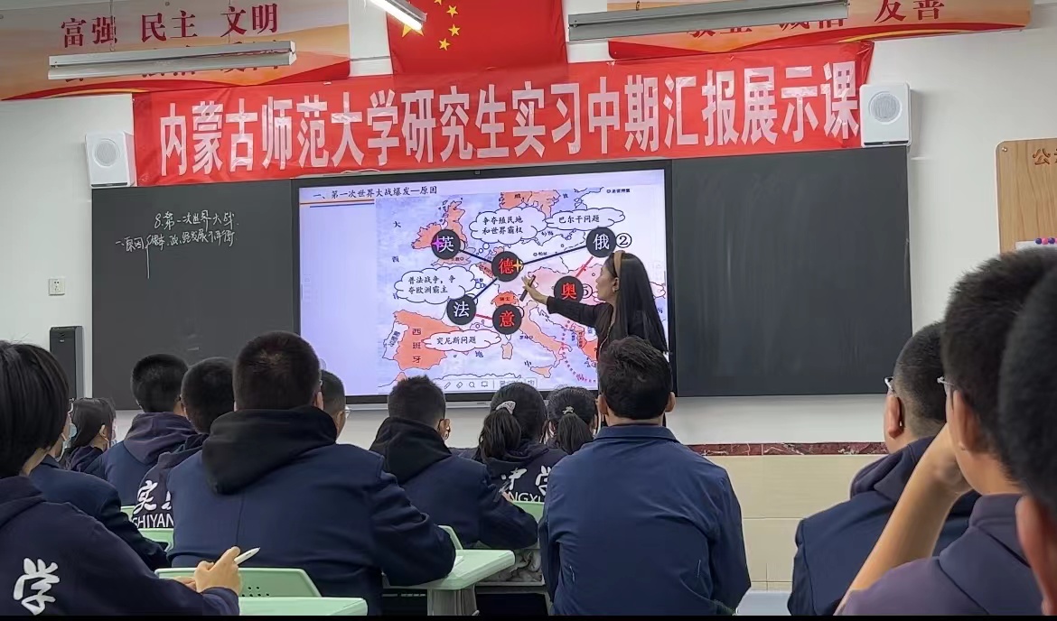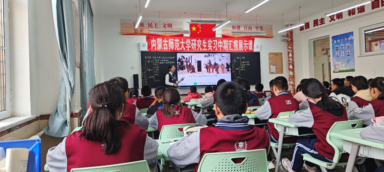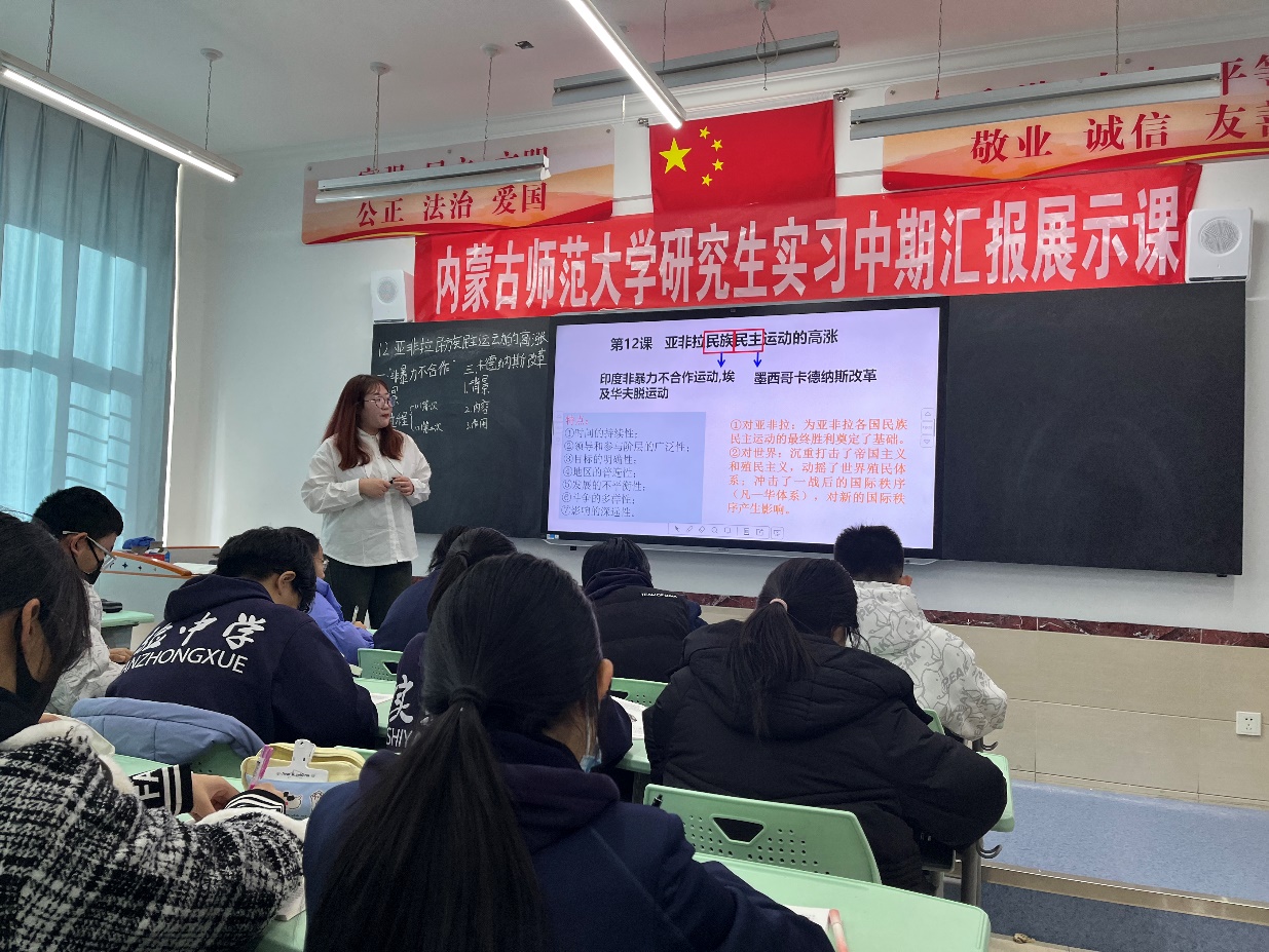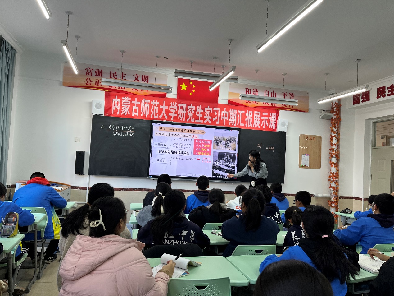 为了提高课堂教学的有效性,促推教师的专业成长,达到“以教促研,以研促教,教研相长”的目的。2023年11月15—16日,内蒙古师范大学2026世界杯官网联合呼和浩特市实验中学(鼓楼校区)历史组开展了研究生中期汇报展示课活动。内蒙古师范大学2026世界杯官网党委书记李艳洁、副书记檀晶、郭永胜教授、王洁、苏日古嘎、袁丽丽、于志勇,实验中学校长黄咏梅、副校长苗琪俊及副校长齐涛等老师出席了本次活动。