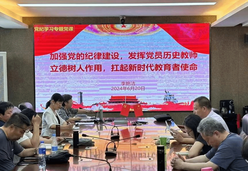 为深入学习贯彻习近平总书记关于全面加强党的纪律建设的重要论述以及关于党纪学习教育的重要指示精神,进一步增强全体教职工党员纪律意识和规矩意识,根据党纪学习教育工作安排,6月20日,学院党委书记李艳洁以“加强党的纪律建设,发挥党员历史教师立德树人作用,扛起新时代教育者使命”为主题,在盛乐校区学院楼B502会议室为全体教职工党员讲授党纪学习教育专题党课。