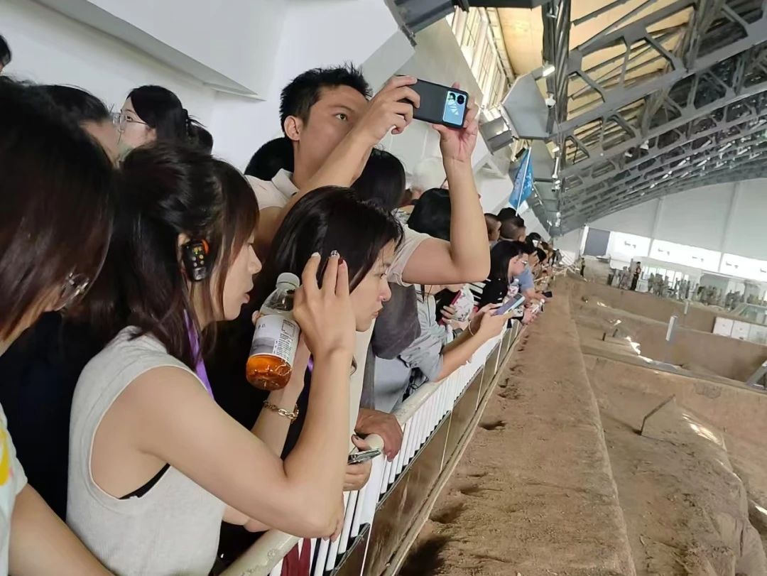 秦始皇陵兵马俑是第一批全国重点文物保护单位、第一批中国世界遗产,被誉为“世界第八大奇迹”。同学们在讲解员的带领下走进兵马俑博物馆,眼前的景象如同一幅恢弘的历史画卷徐徐展开,数以千计的陶俑排列整齐,每个兵马俑的姿态、面部表情和服饰细节都栩栩如生,无一不在透露着工匠们的心血与智慧。这些兵马俑不仅是秦始皇陵墓的重要陪葬品,更是研究秦朝军事、文化和社会结构的重要实物资料。通过观察不同的士兵类型和阵列布局,大家对秦朝军队的兵员构成有了更直观的认识。