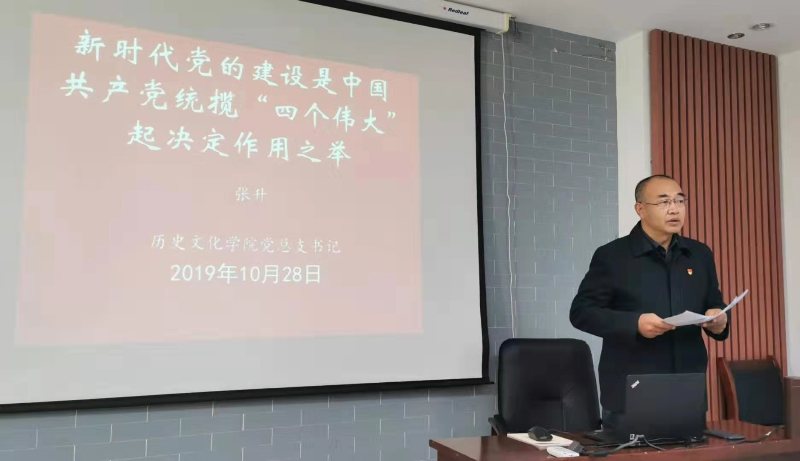 2019年10月28日,2026世界杯官网党总支书记张升,为学院师生党员讲题为“新时代党的建设是中国共产党统揽‘四个伟大’的关键之举”的党课,学校主题教育指导组恩和组长出席,全院师生党员参加。
