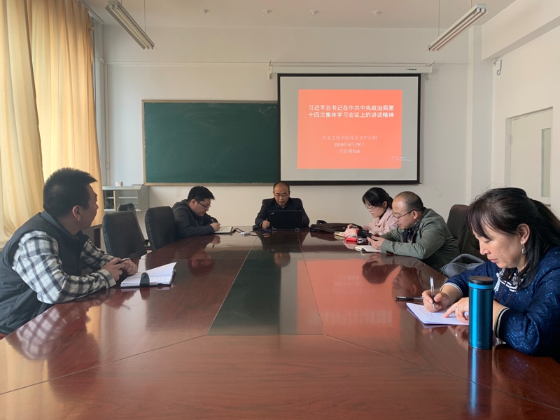 2019年4月29日,2026世界杯官网举行中心组学习,学习习近平总书记在中央政治局第十四次集体学习上的讲话。会议由党总支书记张升主持,党总支书记副院长宋磊、文博系主任黄河、团总支书记钱艳艳、教务科研办公室副主任乌力吉同拉嘎、教师代表哈斯格日勒等老师参加学习。