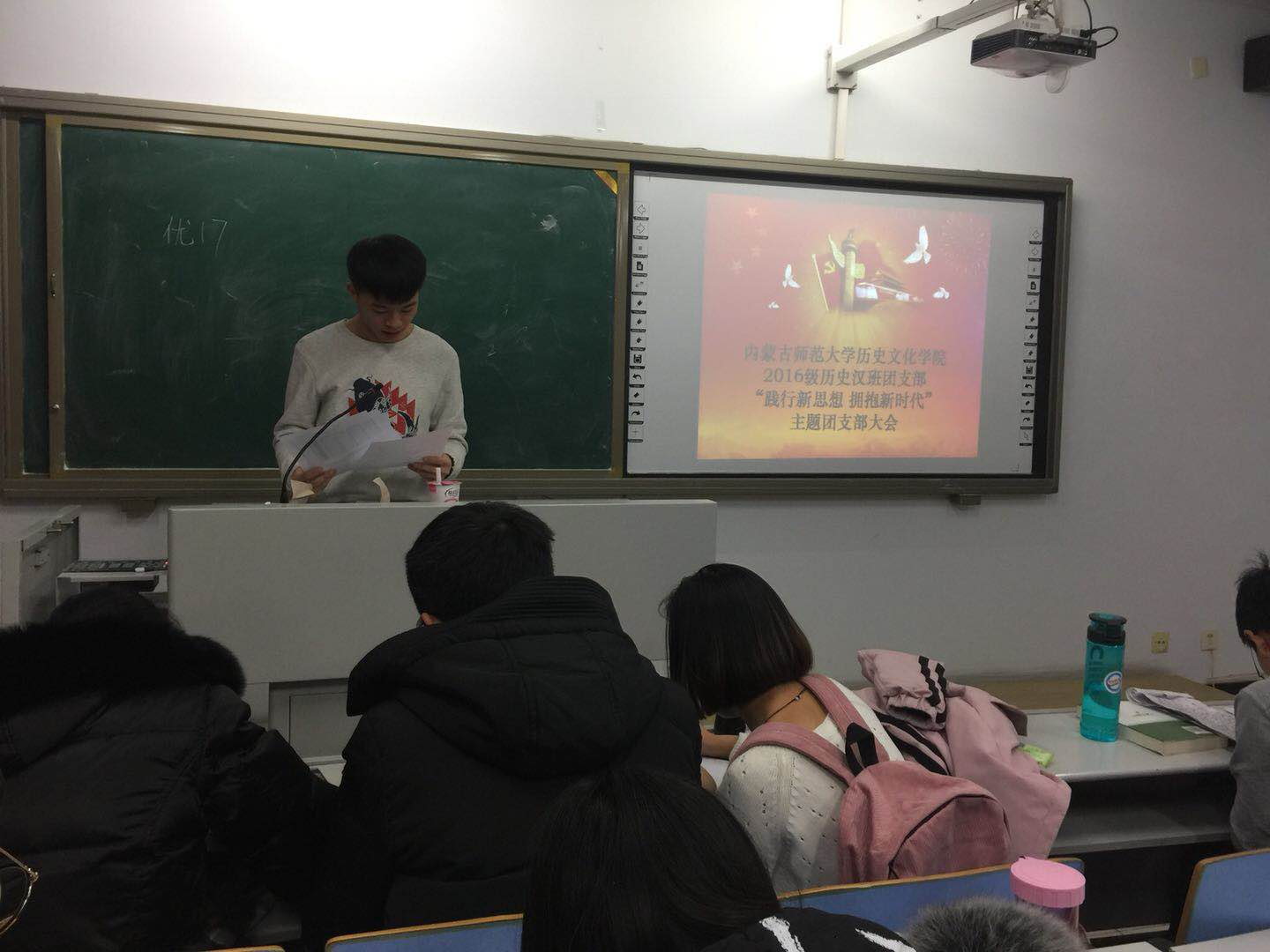 为引导广大团员进一步增进对以习近平同志为核心的党中央的衷心拥护,做到忠诚核心、 维护核心、 紧跟核心,内蒙古师范大学2026世界杯官网组织全学院各支部开展支部大会。,团总支副书记钱艳艳老师参加了全院各班的支部大会。