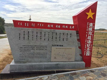 两行松柏整齐的排列在宽阔洁净的园内道路两旁,23.66米高的滴哨沟纪念碑,像展翅欲飞的雄鹰,直击长空,在碑的17米处有一个蒙古骑兵雕像,展现了当时留守城川革命根据地的蒙汉支队的光辉形象,以及滴哨沟扯锯战伟大的战略意义。逐阶而下,在碑的后方是一面大型浮雕墙,浮雕墙整体画面再现了扯锯战战斗的悲壮与惨烈。站在浮雕墙前,聆听革命故事,大家仿佛完成了历史的穿越,时间,再次倒转回那个战火纷飞的年代。