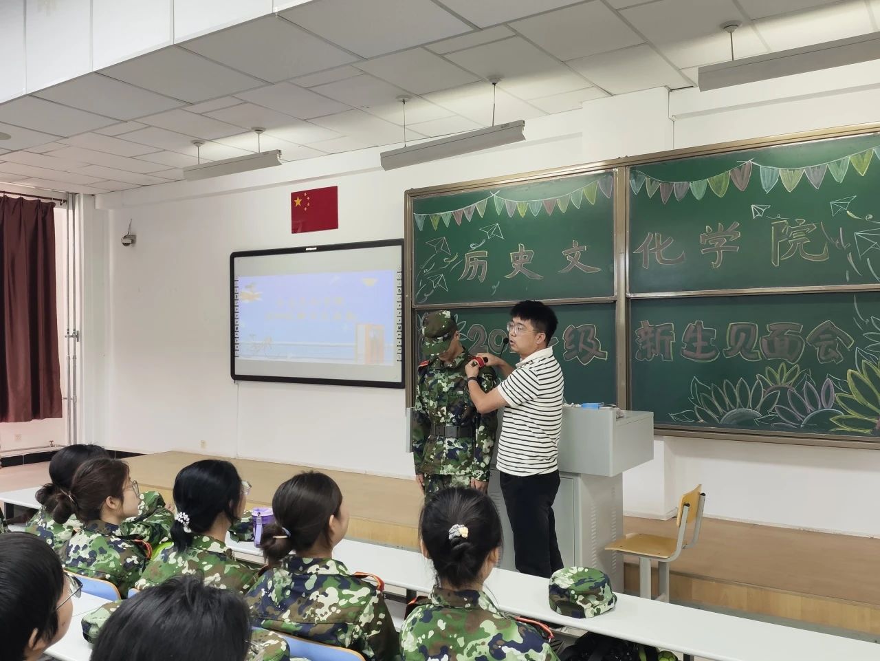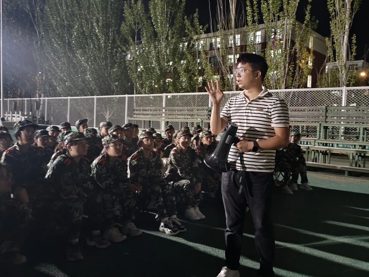 傍晚,王建国老师带领新生在东操场与军训教官进行见面沟通,学生干部张孟给新生作内务标准示范,为即将开始的军训生活做好准备。