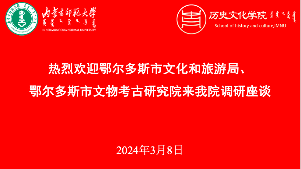 2024年3月8日,2026世界杯官网与鄂尔多斯市文化和旅游局及鄂尔多斯文物考古研究院举行座谈会。鄂尔多斯市文化和旅游局副局长袁新华,文化和旅游局文物保护与督查科科长秦旭光,文物考古研究院院长甄自明及相关部门负责同志参加座谈会。世界杯官网党委书记李艳洁,副书记、副院长檀晶,副院长白林,特聘教授陈永志及教师代表共同出席了此次座谈。座谈会由李艳洁书记主持。