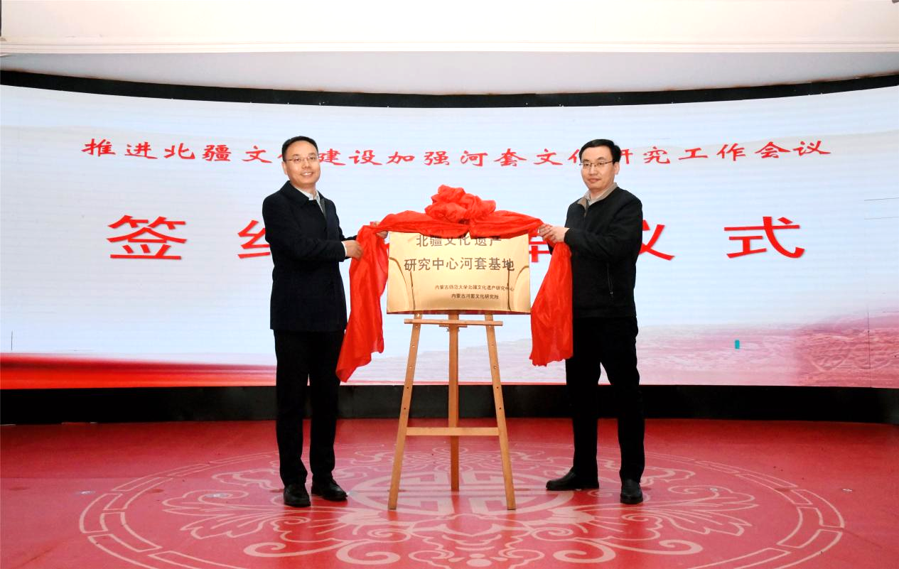 巴彦淖尔市委常委、宣传部部长贺连辉(左)与世界杯官网党委委员、副校长公茂果为“北疆文化遗产研究中心河套基地”揭牌
