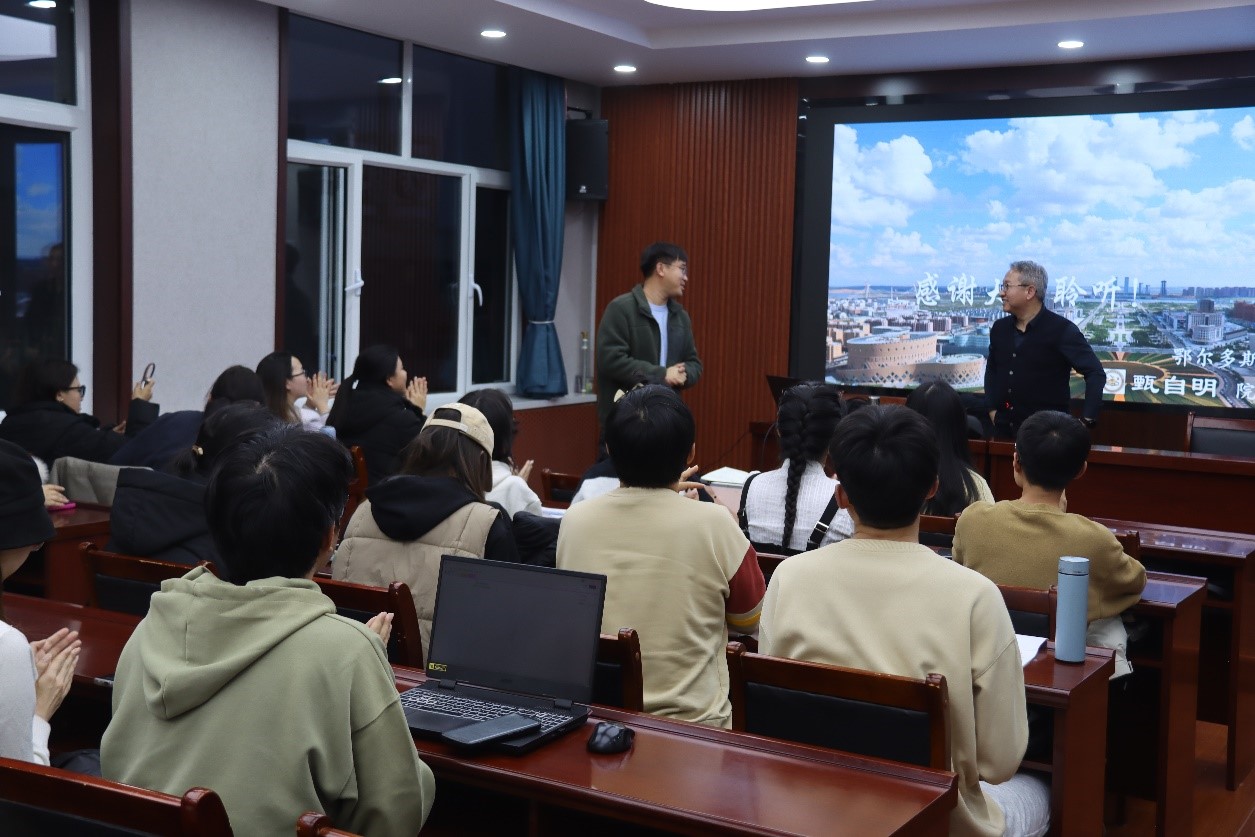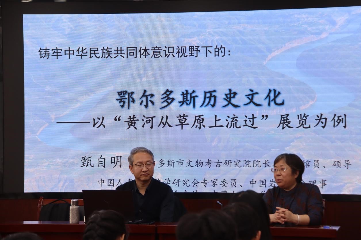 2024年11月28日下午3点,世界杯官网在盛乐校区学院楼B区602室举办了“铸牢中华民族共同体意识视野下的鄂尔多斯历史文化—‘以黄河从草原上流过’展览为例”的主题讲座。讲座由鄂尔多斯市文物考古研究院院长甄自明研究员主讲,学院党委书记李艳洁主持,副院长白林、考古文博系主任李鹏珍以及22、23级考古文博班的全体同学参加。